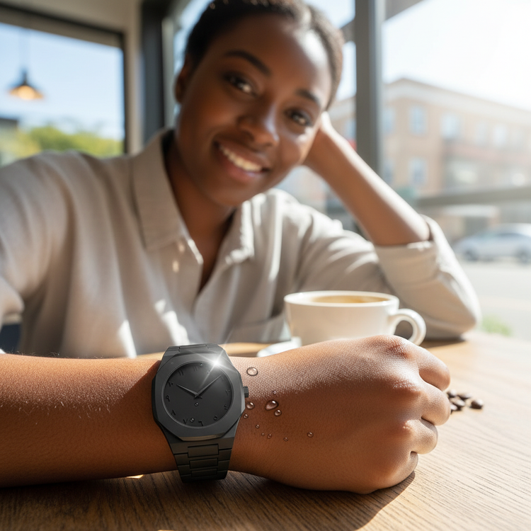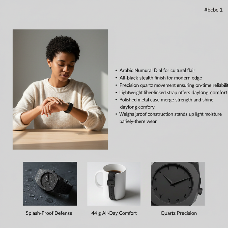 • Arabic Numeral Dial for cultural flair • All-black stealth finish for modern edge • Precision quartz movement ensuring on-time reliability • Lightweight fiber-linked strap offers daylong comfort • Polished metal case merges strength and shine • Splash-proof construction stands up to light moisture • Weighs just 44g for barely-there wear